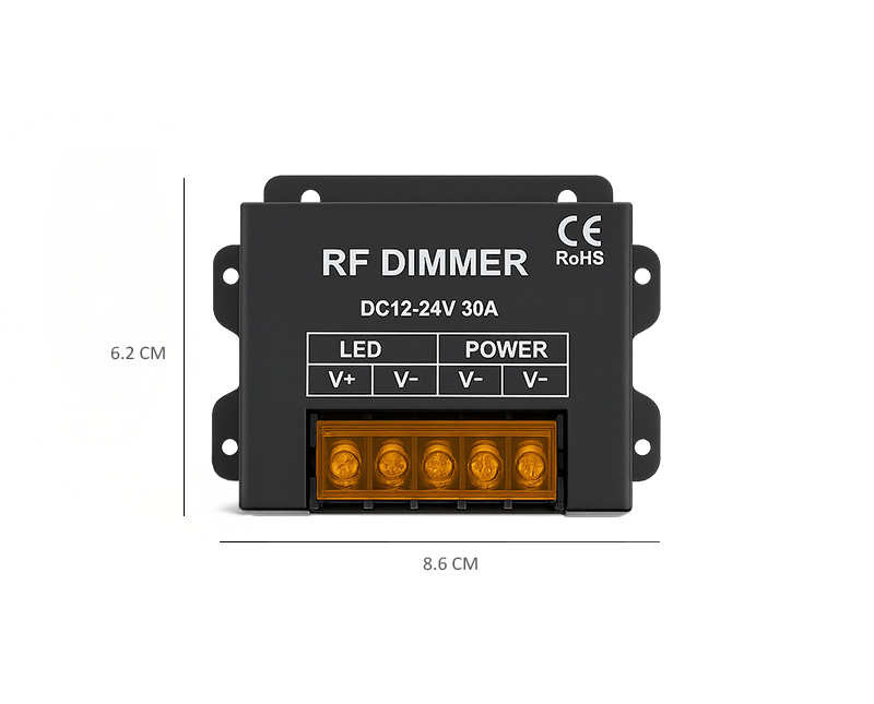 דימר אלחוטי עם שלט לסרטי לד – מתח הפעלה 12 -24V זרם 30 AMPER שיטת שידור RF, מותאם לסרטי לדים.